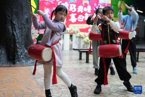 2月25日,小朋友在杭州青少年活動(dòng)中心參加腰鼓隊(duì)巡游表演。(新華社記者 黃宗治 攝)