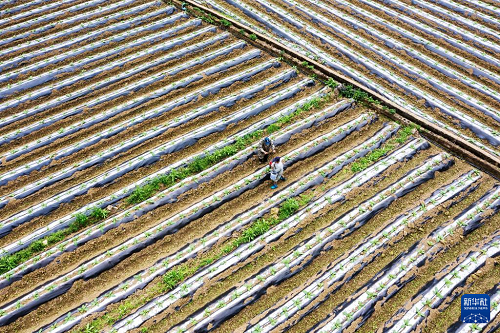 2月25日,農(nóng)民們?cè)趶V西靖西市地州鎮(zhèn)古文村田間勞作(無(wú)人機(jī)照片)。(新華社發(fā) 趙京武 攝)