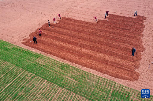 2月25日,河南省沁陽(yáng)市王曲鄉(xiāng)東王曲村,農(nóng)民在田間整地作畦(無(wú)人機(jī)照片)。(新華社發(fā) 楊帆 攝)