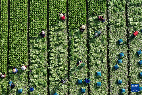 2月24日,農(nóng)民在四川成都市彭州市九尺鎮(zhèn)玉源社區(qū)的田地里采收油麥菜(無(wú)人機(jī)照片)。(新華社發(fā) 羅國(guó)楊 攝)