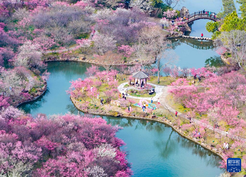 2月25日,游客在江蘇南京明孝陵梅花山上賞梅踏春(無人機照片)。(新華社發(fā) 楊素平 攝)