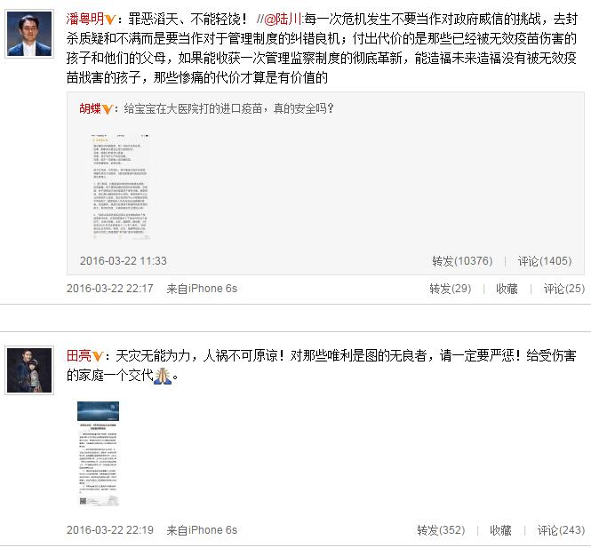 主持人胡蝶對(duì)疫苗產(chǎn)生莫大的質(zhì)疑,稱:“給寶寶在大醫(yī)院打的進(jìn)口疫苗,真的安全嗎?”隨后,陸川轉(zhuǎn)發(fā)此微博,并寫道:“每一次危機(jī)發(fā)生不要當(dāng)作對(duì)政府威信的挑戰(zhàn),去封殺質(zhì)疑和不滿而是要當(dāng)作對(duì)于管理制度的糾錯(cuò)良機(jī);付出代價(jià)的是那些已經(jīng)被無(wú)效疫苗傷害的孩子和他們的父母,如果能收獲一次管理監(jiān)察制度的徹底革新,能造福未來(lái)造福沒有被無(wú)效疫苗戕害的孩子,那些慘痛的代價(jià)才算是有價(jià)值的。”潘粵明也寫在微博下“罪惡滔天、不能輕饒”的話語(yǔ)。