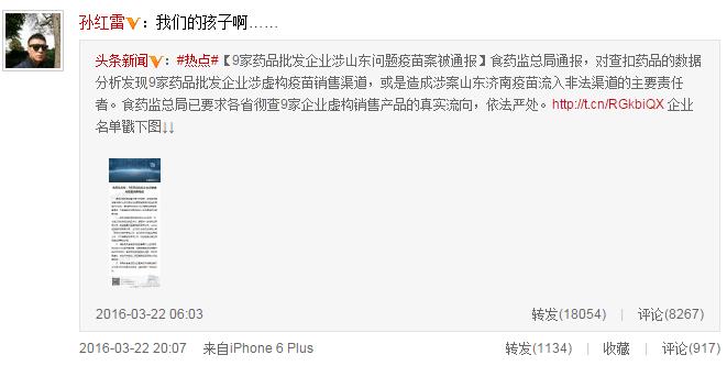 繼章子怡、賈乃亮等人在微博發(fā)聲關(guān)注疫苗安全問題后,3月22日晚,孫紅雷也在微博心痛呼叫“我的孩子……”任賢齊在微博中寫道:“請(qǐng)重視并嚴(yán)懲無(wú)良商人!別讓這些混蛋荼毒孩子們的健康!”舒淇、趙薇也排隊(duì)轉(zhuǎn)發(fā)并利用自身名人效應(yīng)呼吁。