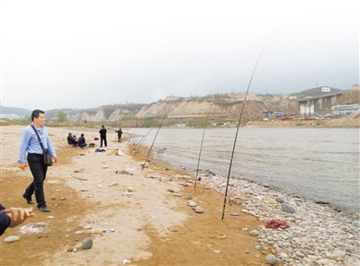 當(dāng)日下午3時(shí)許,蘭州晨報(bào)記者在雁白大橋西側(cè)的黃河岸邊看到12把魚竿一字排開,3名釣魚者坐在旁邊沙灘上正在等待魚兒上鉤,還有兩名中年男子正在周圍撒網(wǎng)。在相隔十多米處,記者發(fā)現(xiàn)還有兩名男子分別撐著魚竿釣魚,有一名捕魚者在撒網(wǎng)?!斑@是雙面粘漁網(wǎng),河內(nèi)稍大一些的魚兒只要撞進(jìn)網(wǎng)里就擺脫不了。”一名捕魚男子得意地說。