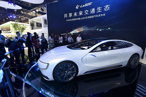 4月25日,觀眾在參觀車展展出的樂視電動(dòng)汽車。當(dāng)日,2016(第十四屆)北京國際汽車展覽會(huì)在京開幕。新華社記者鞠煥宗攝