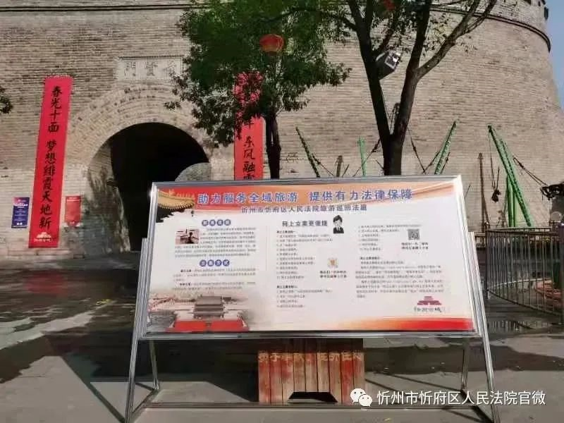 隨著我市旅游業(yè)迅猛發(fā)展,來自全國各地的游客不斷增加,為更好地助力忻府區(qū)旅游業(yè)提檔升級,滿足人民日益增長的多元司法需求,國慶黃金周期間,忻府區(qū)法院在忻州古城內(nèi)設(shè)立旅游巡回法庭宣傳展板,為游客提供導(dǎo)訴指南服務(wù)。