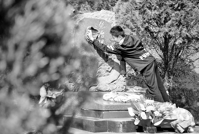 2021年4月4日,河南信陽(yáng),一位烈士后人在鄂豫皖蘇區(qū)首府烈士陵園里擦拭墓碑。新華社發(fā)