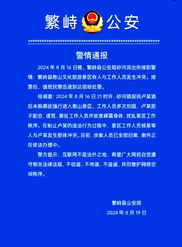 經(jīng)調(diào)查:2024年8月16日21時(shí)許,砂河鎮(zhèn)居民盧某酒后未購(gòu)票欲強(qiáng)行進(jìn)入憨山景區(qū),工作人員多次勸阻,盧某拒不配合,謾罵、撕扯工作人員并故意裸露身體,擾亂景區(qū)工作秩序。在制止盧某的違法行為過(guò)程中,景區(qū)工作人員楊某等人與盧某發(fā)生肢體沖突。目前,涉案人員已全部歸案,案件正在依法辦理中。