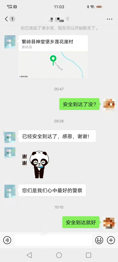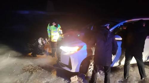 接到報(bào)警后,神堂堡派出所民警迅速通過電話聯(lián)系報(bào)警人,得知車上共有七人,多為婦女兒童,民警首先安撫游客情緒,并在確定具體地點(diǎn)后,立即與神堂堡交警中隊(duì)民警驅(qū)車趕往事發(fā)地。到達(dá)現(xiàn)場(chǎng)后,民警了解到,報(bào)警人張某與家人朋友自駕前往五臺(tái)山旅游,開到蓮花崖大峽谷山區(qū)路段時(shí)由于路面有冰導(dǎo)致車輛打滑沖出路面,車輛正被困在一處斜坡處,距離前面的深溝只有一米左右,進(jìn)退兩難,無(wú)法動(dòng)彈。此時(shí),車上幾名游客已凍得瑟瑟發(fā)抖,情況不容樂觀。民警們第一時(shí)間制定救援措施,他們不畏嚴(yán)寒、相互配合,經(jīng)過長(zhǎng)時(shí)間的努力,終于將被困車輛從冰面推到了無(wú)冰路段。車輛脫困,游客對(duì)民警們的及時(shí)救援表示了由衷的感謝,緊緊握住民警的手,激動(dòng)地說:“非常感謝警察同志的幫助,您們是我們心中最好的警察!”