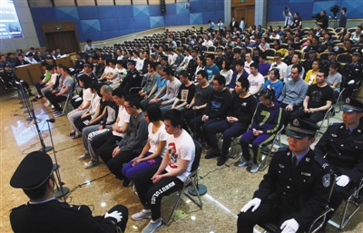 因為被告人太多,法院最大的法庭也無法容納。開庭前法院已將最大法庭前4排旁聽席的座位拆下,以擴(kuò)大審判區(qū)的面積,同時從兄弟法院協(xié)調(diào)了法警30人,出動了12輛警車接送被告人。