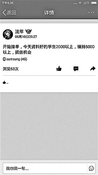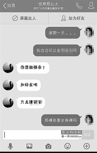 13日,記者調(diào)查發(fā)現(xiàn),在一些借款群中,女大學生“裸持”借款已經(jīng)成為公開的秘密,通過“裸持”可以借款的金額是普通借款額度的2至5倍,但逾期未還將面臨裸照被公布的威脅,甚至有借款人威脅“裸持”借款的女生提供性服務。