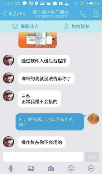 記者以求購機(jī)票信息為名在網(wǎng)上找到了十幾名以此為業(yè)的QQ用戶。其中,用戶名為“能力越大脾氣越大”的用戶告訴記者,每條航空機(jī)票信息售價(jià)18元,可以挑選特定的航空公司,買多了,價(jià)格還可以優(yōu)惠。他告訴記者,自己是通過軟件入侵后臺(tái)程序“調(diào)取”機(jī)票信息,而且都是客戶有需求的時(shí)候才去“調(diào)取”,保證信息新鮮有效。