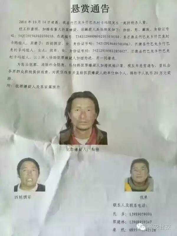 10月18日,甘孜藏族自治州公安局通過官方認(rèn)證微信“平安甘孜”發(fā)布的通緝令顯示,經(jīng)工作查明,加措有重大作案嫌疑。加措生于1969年2月3日,芒康縣竹巴龍鄉(xiāng)竹巴龍村卡瑪組人,在逃編號為“T5421290000002015030301”。其妻子四朗擁宗和女兒找弟協(xié)助犯罪嫌疑人加措外逃,并一同潛逃。