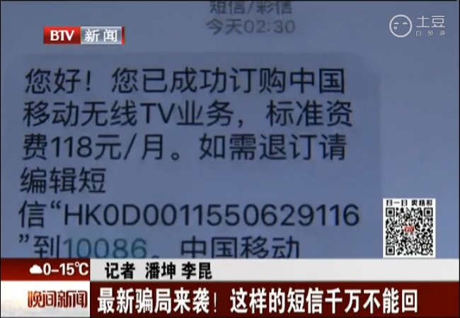 中國(guó)經(jīng)濟(jì)網(wǎng)北京11月4日訊 “您好!您已成功訂購(gòu)中國(guó)移動(dòng)無(wú)線TV業(yè)務(wù),標(biāo)準(zhǔn)資費(fèi)118元/月。如需退訂,請(qǐng)編輯短信HK***到10086?!局袊?guó)移動(dòng)】”11月2日北京電視臺(tái)《晚間新聞》報(bào)道,近日,北京市民王小姐收到了“中國(guó)移動(dòng)”發(fā)來(lái)的這樣一條服務(wù)訂購(gòu)短信。