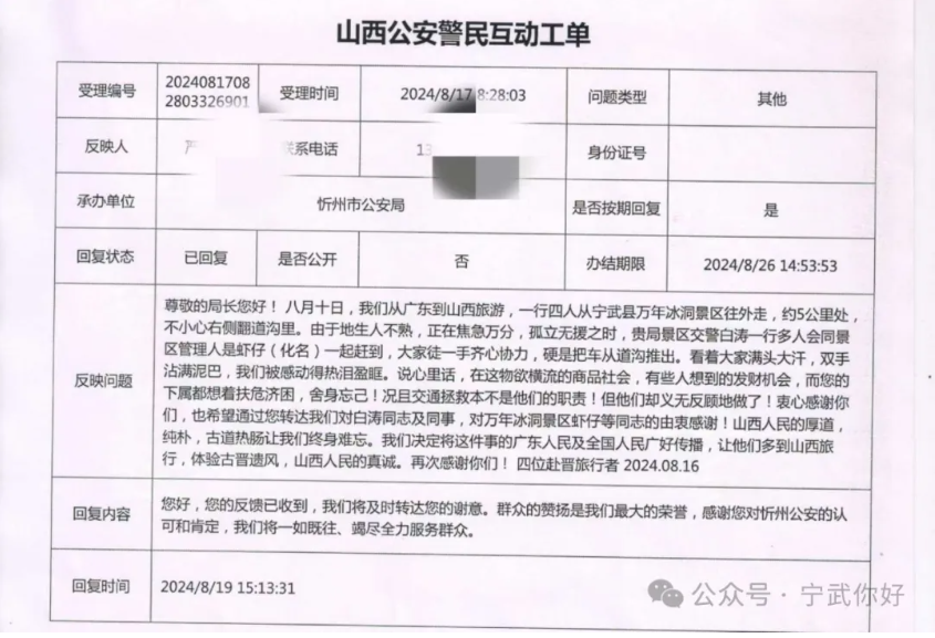 群眾無小事,點滴映初心。8月19日,寧武縣公安局收到忻州市公安局轉來的山西公安警民互動工單,廣東省的嚴先生在平臺留言致謝:“8月10日,我們從廣東到山西旅游,一行四人從寧武縣萬年冰洞景區(qū)往外走,不小心右側翻到溝里。由于人生地不熟,正在焦急萬分,孤立無援之時,貴局景區(qū)民警白濤一行多人會同景區(qū)管理人員一起趕到,大家齊心協(xié)力,硬是把車從道溝推出.....山西人民的厚道淳樸、古道熱腸讓我們終身難忘,我們決定將這件事向廣東人民及全國人民友好傳播,讓他們多到山西旅行,體驗古晉遺風,山西人民的真誠。再次感謝你們!”