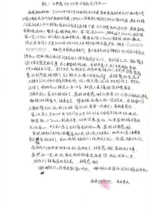 10月9日,忻州市公安局反詐中心收到了受害人親筆寫下的感謝信,信中表達了對忻州反詐民警真誠而濃厚的謝意。