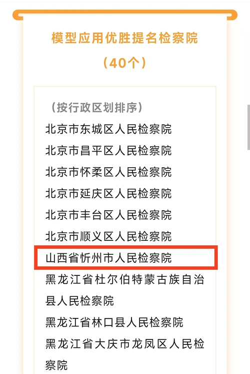 1月8日,最高檢組織的2024年全國檢察機關(guān)大數(shù)據(jù)法律監(jiān)督模型推廣活動評選結(jié)果出爐:忻州市人民檢察院在模型應用活動中進入全國前50名,獲評全國“模型應用優(yōu)勝提名檢察院”。