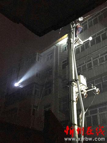 客戶從自家陽臺(tái)上用手電筒為搶修隊(duì)員照明協(xié)助搶修