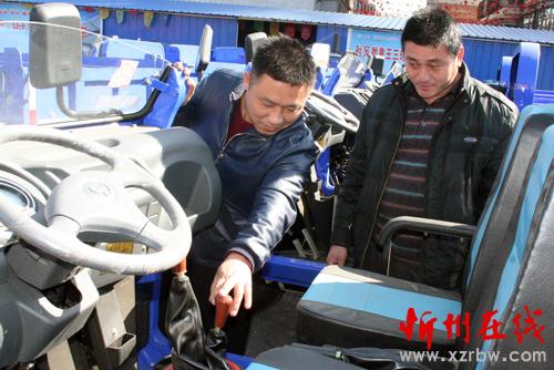2月20日,原平市子干村的農(nóng)民正在農(nóng)機(jī)銷(xiāo)售處挑選時(shí)風(fēng)農(nóng)用車(chē),春節(jié)過(guò)后,該市農(nóng)機(jī)市場(chǎng)紅紅火火,農(nóng)民們?cè)鐐涓瑸榻衲甑拇焊a(chǎn)打下良好基礎(chǔ)。(趙春曉 攝)