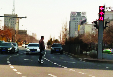 一男子騎助力車橫穿馬路,危險?。ㄍ鯂鴹?攝)