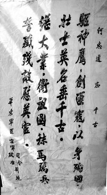 何忠道的犧牲,引起了整個空軍系統(tǒng)的震憾,人民空軍舉行了隆重的追悼大會??哲姍C關(guān)、華東軍區(qū)、生前所在部隊機關(guān)、戰(zhàn)友送了幾十幀挽幛??哲娝玖顔T劉亞樓、副司令員常乾坤、副政委吳法憲、參謀長王秉璋聯(lián)名敬獻的挽幛上書:“殲滅美國侵略者,堅決保衛(wèi)祖國領(lǐng)空,為何忠道同志復仇!”華東軍區(qū)司令部、政治部敬獻的挽幛上書:“驅(qū)神鷹,創(chuàng)飛寇,以身殉國,壯士英名垂千古。創(chuàng)大業(yè),衛(wèi)祖國,秣馬厲兵,誓殲殘敵慰英靈?!?/p>