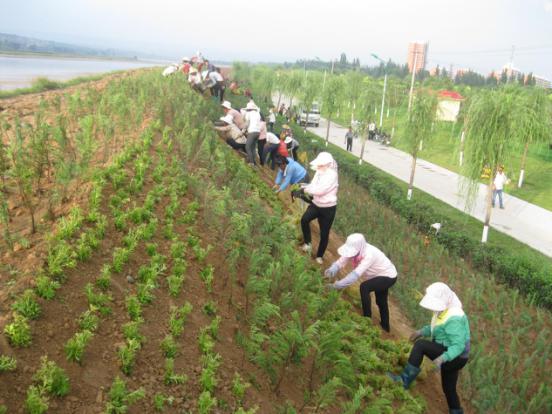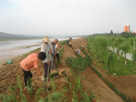 8月24日,河曲縣城北防護(hù)堤上植綠場(chǎng)面熱火朝天:數(shù)十名工人在堤上成排栽植爬地柏,坡面栽成菱形邊;菱形內(nèi)外栽植花草“三七景天”;園林綠化車輛跟進(jìn)澆水。