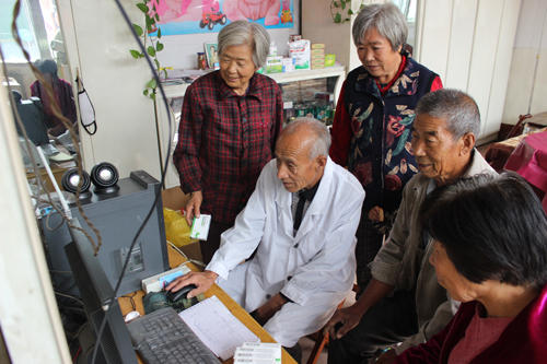 在衛(wèi)生所診療室,醫(yī)師張喜旺為患者開電子處方 來到北義井村衛(wèi)生所,不足20平米的診療室里已經(jīng)站滿了患者。醫(yī)師張喜旺向高血壓病人李梅蘭詢問病情后又為其測量了血壓。緊接著,他打開區(qū)域衛(wèi)生信息管理平臺,拿著農(nóng)村合作醫(yī)療卡在刷卡機上一刷,信息就自動提取到平臺,張喜旺結(jié)合病人病情開了電子門診處方并下藥,費用直接從農(nóng)合醫(yī)療卡中扣除,整個過程不到十分鐘。張喜旺說,村民們大都都是奔著診療方便和藥品范圍內(nèi)免費而來,這也大大緩解了村民看病難的問題。