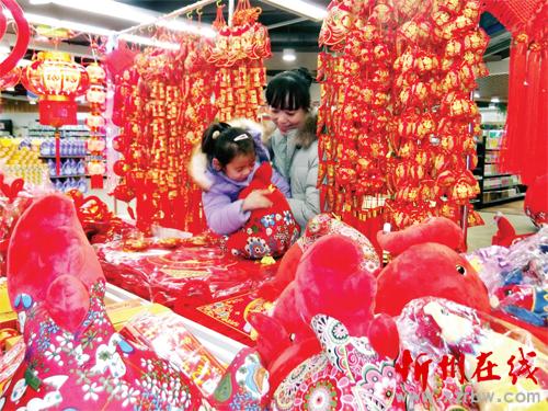 春節(jié)越來越近,我市各地迎新春氣氛越來越濃,市場上吉祥喜慶的商品琳瑯滿目,年味十足。1月10日,原平市一對母子正在挑選迎春飾品。(趙春曉 攝)