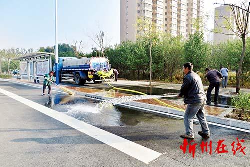 10月12日,在建設(shè)路北拓路段,工人們正在加班加點(diǎn)認(rèn)真清洗打掃道路。最近幾天,忻州城區(qū)新修道路和新改造道路建設(shè)工程相繼竣工通車,市市容環(huán)境衛(wèi)生管理處和市園林管理局組織人員及時(shí)清洗道路塵埃,處處呈現(xiàn)出街寬路闊潔凈新貌。魯明強(qiáng) 攝