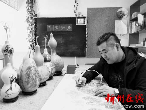 在定襄縣,有一個叫王燕軍的后生,他的愛好比較獨特,常手持一把小烙鐵,在葫蘆上熨出烙痕作畫,大家都親切地喊他“葫蘆娃”。王燕軍的這種工藝叫烙畫,又稱燙畫、火種刺繡、火筆畫,起源于漢代,興于唐宋,是一類極其珍貴的畫種。