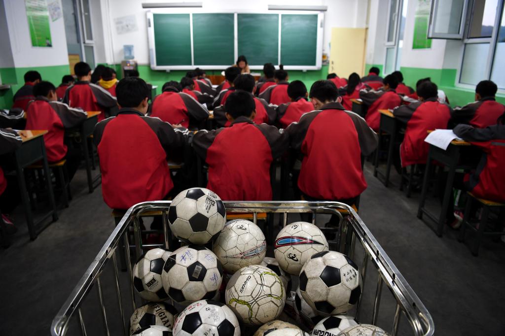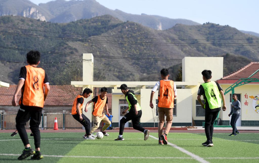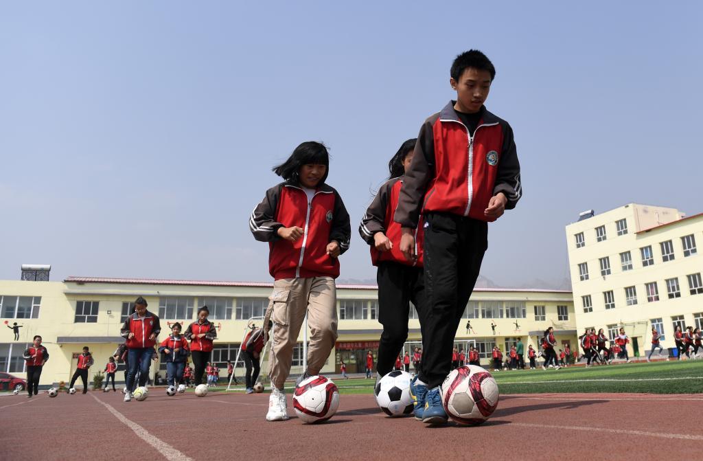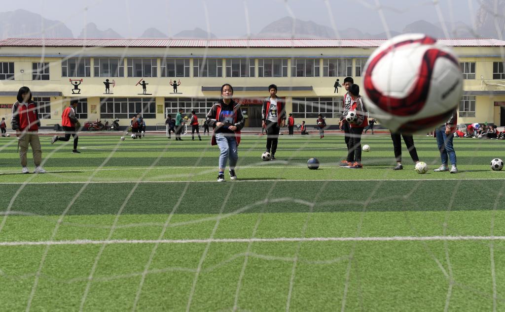 ↑這是學生們在體育課上進行射門訓練(4月18日攝)。新華社記者李俊東攝