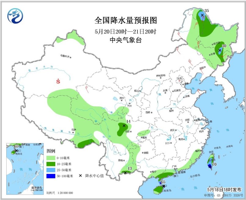 5月20日20時至21日20時,四川盆地西部、黑龍江西北部和東南部、吉林東北部、廣東西南部、廣西東南部、海南島東北部等地的部分地區(qū)有中到大雨,局地有暴雨(50~65毫米)。內(nèi)蒙古東部、東北地區(qū)中南部、華北北部、黃淮東部等地的部分地區(qū)有4~6級風(fēng)。南疆盆地等地局地有浮塵或揚沙。