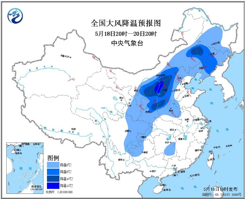 預(yù)計,5月18日20時至20日20時,西北地區(qū)大部、華北大部、東北地區(qū)、黃淮、新疆等地的部分地區(qū)有5~7級風(fēng),陣風(fēng)可達(dá)8~9級,其中,內(nèi)蒙古中部和東部、山西北部、河北北部等地局地陣風(fēng)可達(dá)10級以上;東北地區(qū)大部、華北中東部、黃淮西部、西北地區(qū)東部、西南地區(qū)東部等地最低溫度或平均溫度將下降6~8℃,其中,內(nèi)蒙古中部偏南地區(qū)、陜西北部、山西北部、吉林西部等地的部分地區(qū)降溫10℃以上。中央氣象臺5月18日18時繼續(xù)發(fā)布大風(fēng)降溫預(yù)報。