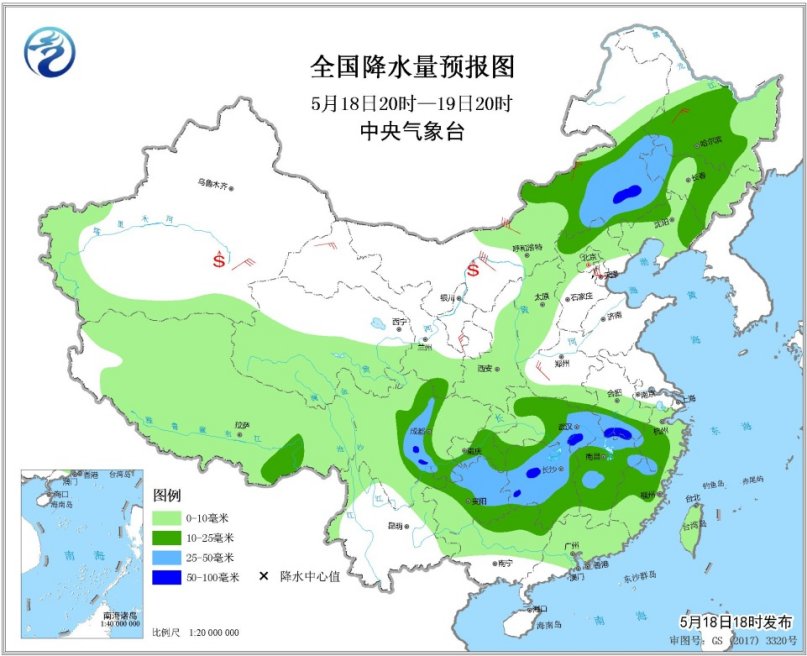 5月18日20時至19日20時,內(nèi)蒙古中東部、東北地區(qū)中部、四川盆地西部、西南地區(qū)東部、江漢、江南等地的部分地區(qū)有中到大雨,其中內(nèi)蒙古東南部、四川盆地西南部、湖南北部、湖北南部、安徽南部等地局地有暴雨(50~80毫米),上述部分地區(qū)有短時強降水,局部并伴有雷暴大風(fēng)等強對流天氣。西北地區(qū)中東部、內(nèi)蒙古大部、華北、東北等地的部分地區(qū)有5~7級風(fēng),局地陣風(fēng)8~9級。內(nèi)蒙古西部、南疆盆地等地有揚沙或浮塵天氣。