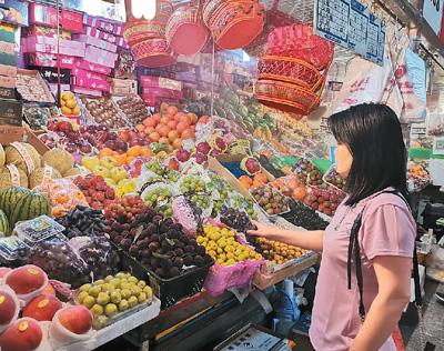 北京三源里菜市場(chǎng),品種豐富的進(jìn)口及國(guó)產(chǎn)水果吸引市民駐足選購(gòu)。本報(bào)記者 孔德晨攝