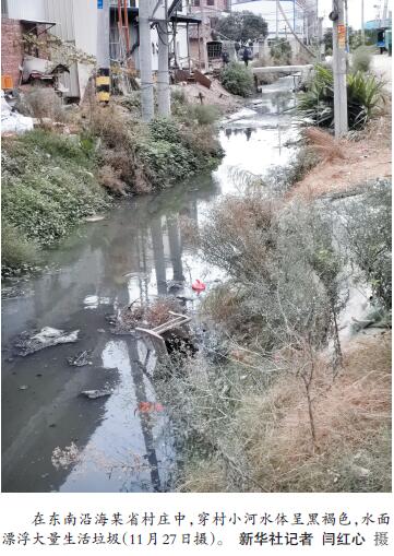 在東南沿海某省村莊中的一座小橋上,一幅寫(xiě)著“小康不小康,關(guān)鍵看老鄉(xiāng)”的巨型宣傳牌十分醒目。然而,在被廣告牌擋住的地方,水面漂浮大量的塑料袋、易拉罐、泡面盒等生活垃圾,水體呈黑褐色。