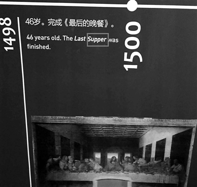 該網(wǎng)友發(fā)現(xiàn),在這個(gè)介紹達(dá)·芬奇生平的年表上,英文錯(cuò)誤不止一處:關(guān)于達(dá)·芬奇46歲的經(jīng)歷,展覽介紹說:“46歲。完成《最后的晚餐》”,其對(duì)應(yīng)的英文翻譯是“46 years old. The Last super was finished.”而super一詞在英文中的意思是“超級(jí)的”,“晚餐”的英文詞匯實(shí)為supper,該翻譯中少了一個(gè)字母“p”。