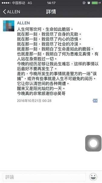 事后,被錯(cuò)抓的大學(xué)生黃誠發(fā)朋友圈感慨“嘗盡恐懼”。