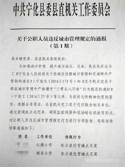 爭議由一份通報文件開始。網(wǎng)傳圖片顯示,一份抬頭為“中共寧化縣委縣直機關(guān)工作委員會”的《關(guān)于公職人員違反城市管理規(guī)定的通報》中,寧化縣針對公職人員違反城市管理規(guī)定行為進(jìn)行專項督查,并對部分公職人員進(jìn)行了公開通報。其中,文件第一頁列明,兩名工作單位分別為紅旗小學(xué)和城東小學(xué)的教師,因為“在占道經(jīng)營攤點買菜”的違規(guī)行為,受到通報處理。
