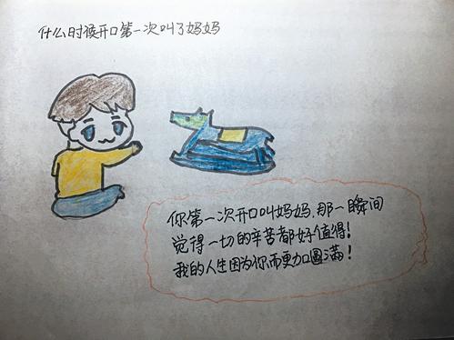 漫畫(huà)中,媽媽抱著襁褓里的嬰兒傷心地哭泣著,這是焦洋畫(huà)的漫畫(huà)中的一幅,是最揪心的一幅漫畫(huà)。旁邊配著焦洋用中性筆工工整整寫(xiě)的大片文字?!耙?yàn)榍闆r危急,媽媽早產(chǎn)一個(gè)月,你出生就要和媽媽分開(kāi),你被送去另一個(gè)醫(yī)院……媽媽每天祈禱,盼著你快快出院,終于在半個(gè)月后把你從醫(yī)院抱回來(lái),那是媽媽第一次抱你,看著你個(gè)小人兒從此與我息息相關(guān)。仿佛那一瞬間明白了責(zé)任是什么,謝謝你寶貝,讓我邁入人生的另一個(gè)階段?!?br /> 焦洋今年33歲,在8年前,她生下兒子派派。孩子的出生并不順利,早產(chǎn)了一個(gè)月,因?yàn)槿毖?,醫(yī)生甚至都建議家人放棄這條小生命??墒墙寡髨?jiān)決不放棄,只要有一絲希望就得拼盡全力。“只聽(tīng)到一聲哭泣后就被醫(yī)生抱走,放進(jìn)保溫箱,我都沒(méi)看到他的模樣,讓我放棄,絕對(duì)不會(huì)同意的。”焦洋說(shuō),因?yàn)楹⒆右怀錾臓顩r非常糟糕,她只好獨(dú)自出院,留下還在保溫箱里的孩子。