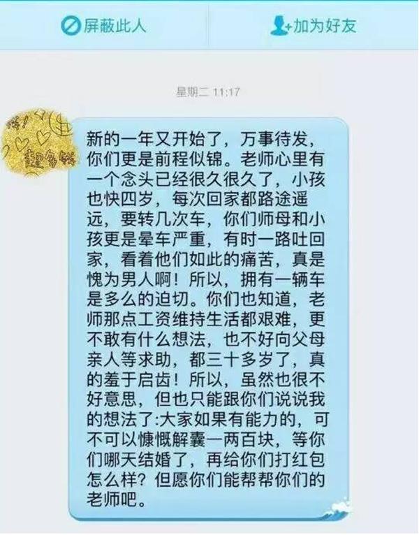 網(wǎng)帖中還上傳了數(shù)張疑似該老師與學(xué)生的QQ聊天截圖,其中的一張截圖中的對(duì)話道出了老師“眾籌”買(mǎi)車(chē)的原因:“新的一年又開(kāi)始了,萬(wàn)事待發(fā),你們更是前程似錦。老師心里有個(gè)念頭已經(jīng)很久了,小孩也快四歲了,每次回家都路途遙遠(yuǎn),要轉(zhuǎn)幾次車(chē),你們師母和小孩更是暈車(chē)嚴(yán)重,有時(shí)一路吐回家,看看他們?nèi)绱送纯?,真是愧為男人??!所以,擁有一輛車(chē)是多么的迫切。你們也知道老師那些工資維持生活都很艱難,更不敢有什么想法,也不好向父母親人求助,都三十多歲了,真的羞于啟齒!所以,雖然也很不好意思,但是也只能跟你們說(shuō)說(shuō)我的想法了:大家如果有能力的,可不可以慷慨解囊一兩百塊,等你們哪天結(jié)婚了,再給你們打紅包怎么樣?但愿你們能幫幫你們的老師吧?!?/p>