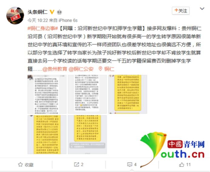 今天上午,記者聯(lián)系當(dāng)?shù)亟逃衷儐柺欠裾莆铡皩W(xué)籍保留費(fèi)”的相關(guān)情況,教育局辦公室工作人員表示,教育局昨天下午便收到消息,并于今天上午由正副局長帶隊(duì)前往新世紀(jì)中學(xué)調(diào)查情況,調(diào)查結(jié)果會(huì)交給沿河縣委宣傳部。今天下午,記者聯(lián)系宣傳部,工作人員表示,新世紀(jì)中學(xué)已將所收“學(xué)籍保留費(fèi)”退還給學(xué)生家長,常務(wù)校長羅元慶被教育局嚴(yán)肅批評(píng),并被學(xué)校董事會(huì)解除職務(wù)。