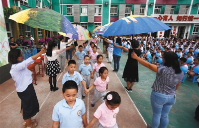 2016年9月1日,海淀區(qū)雙榆樹一小,家長撐起手繪的傘歡迎一年級新生。按照北京市當時規(guī)定,凡年滿6周歲(2010年8月31日以前出生)的兒童參加信息采集,不滿6周歲(2010年8月31日以后出生)的兒童不能采集。資料圖片/新京報記者 浦峰 攝