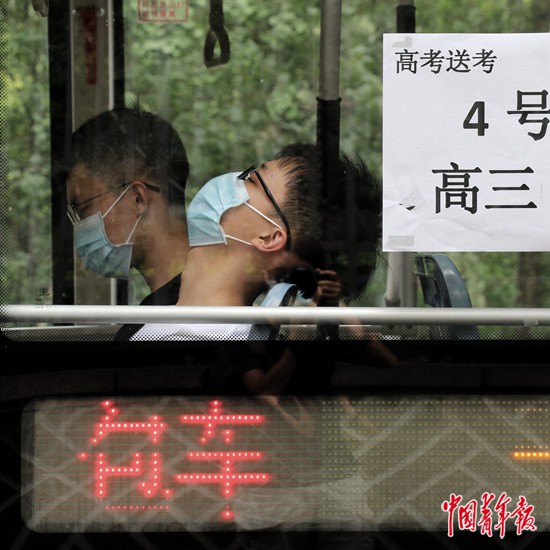 7月7日上午,四川省成都市,剛剛參加完高考語文考試的一位考生坐在車上閉目養(yǎng)神。由于考點(diǎn)不在本校,這位學(xué)生所在的學(xué)校安排了專車接送考生。中青報(bào)·中青網(wǎng)記者 王鑫昕/攝