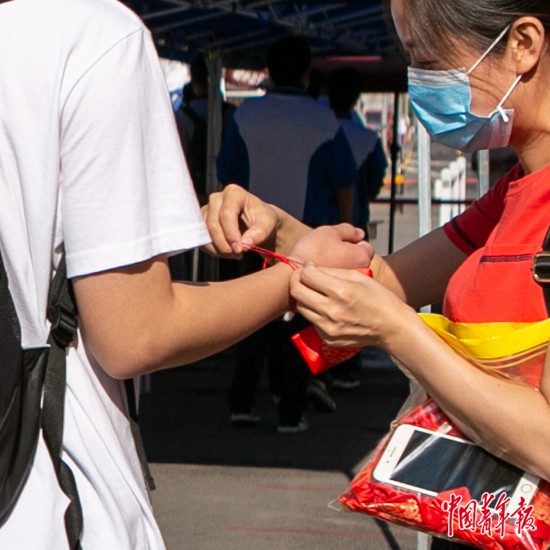 7月7日上午,北京市陳經(jīng)綸中學(xué)門口,一位老師為考生戴上代表幸運(yùn)的紅手鏈。中青報(bào)·中青網(wǎng)見習(xí)記者 曲俊燕/攝