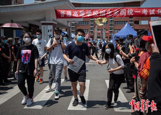 7月7日上午,北京市豐臺區(qū),北京市第十二中學(xué)考點(diǎn),結(jié)束上午的考試后,高考考生們走出考場,一位考生從人群中牽起家人的手。當(dāng)天是2020年全國統(tǒng)一高考第一天,據(jù)了解,今年北京市高考在7月7日至10日舉行,共49000多名考生,設(shè)17個(gè)考區(qū),132個(gè)考點(diǎn)學(xué)校,2867個(gè)考場,每考場考生人數(shù)由過去的30人減至20人。中青報(bào)·中青網(wǎng)記者 李崢苨/攝