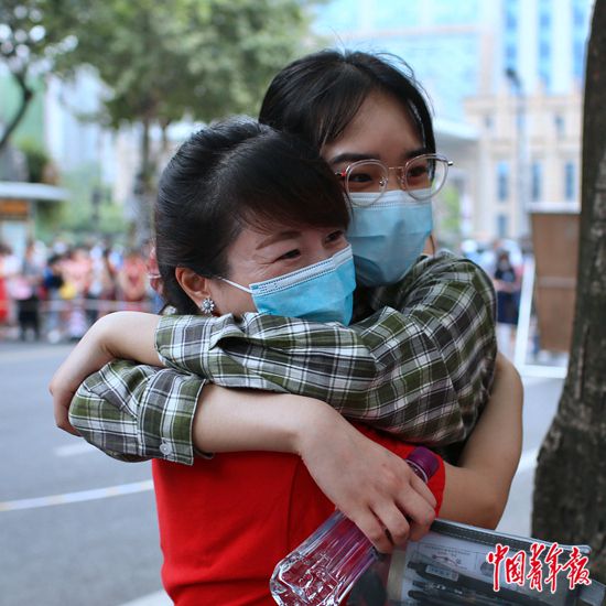 7月7日上午,四川省成都市,成都七中考點(diǎn)門口,一名考生進(jìn)入考場前與老師擁抱。汪龍華/攝