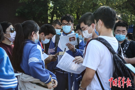 7月7日上午,北京市中國人民大學(xué)附屬中學(xué)朝陽學(xué)校(東校區(qū))門口,考生們在進(jìn)入考場前抓緊時(shí)間看復(fù)習(xí)資料。中青報(bào)·中青網(wǎng)見習(xí)記者 孔斯琪/攝