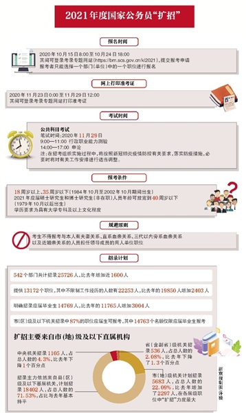 昨日,國家公務員局發(fā)布公告,今日8時起至10月24日18時,可報名中央機關及其直屬機構2021年度考試。542個部門共計招錄25726人,比去年增加近1600人。明確招錄應屆畢業(yè)生14769人,比去年增加3004人。