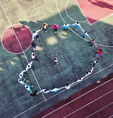 11月9日,在貴州省遵義市鳳岡縣特殊教育學校,老師帶領學生們在操場做游戲。視覺中國供圖